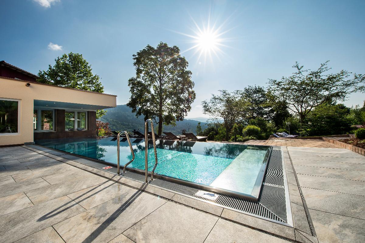 ganzjährig beheiztem Außenpool und Seerosenteich finden sich zahlreiche romantische Liegeplätze auf mehrere Ebenen verteilt. So findet wirklich jeder seinen eigenen Lieblingsplatz.