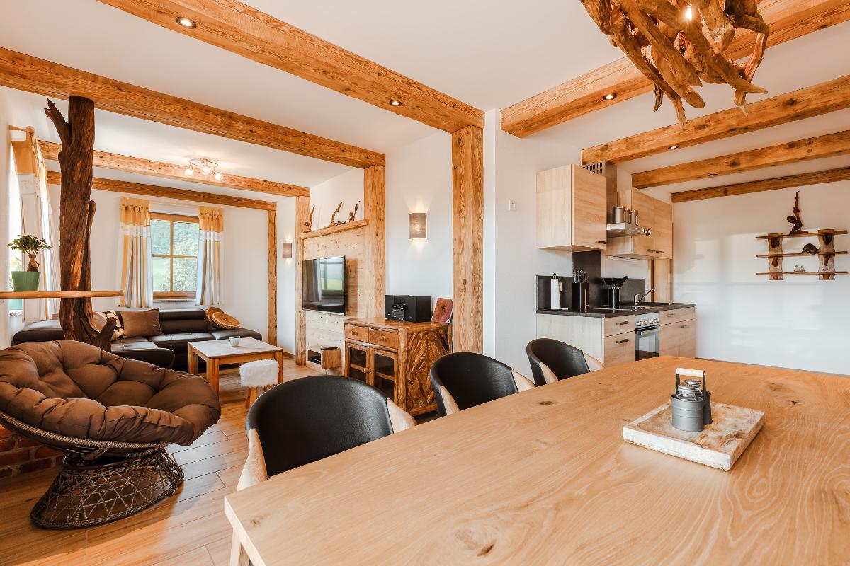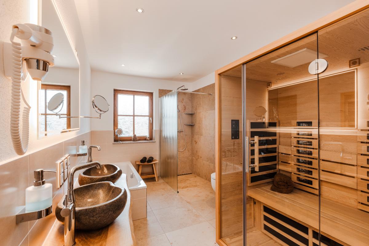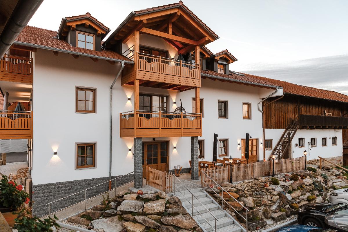 Unser neu gebautes Haupthaus verfügt über vier individuell gestaltete 5-Sterne-Ferienwohnungen mit Aufenthaltsraum (25 m² mit Küchenzeile und TV) und Gäste-WC im Erdgeschoss. Im ersten und zweiten Stock befinden sich je zwei Wohnungen, erreichbar über das separate Treppenhaus. Die Ferienwohnungen haben eine Wohnfläche zwischen 70 und 85 m² plus Balkon(e) und bieten Platz für bis zu 5 Personen (Wohnung Wurzelstube 6 Personen). Alle Wohnungen sind mit Fußbodenheizung, 2 Schlafzimmern, Dusche (ebenerdig)/WC, separates WC, Lan, WLan, UHD-TV-Sat mit UHD/Blu Ray-Player in allen Wohnräumen, TV-Sat in allen Schlafräumen,  Küchenzeile, Essecke, Wohnzimmercouch und Zimmersafe ausgestattet. Die Wohnung Wurzelstube verfügt zusätzlich über eine Badewanne und eine Infrarotkabine für zwei Personen. Wir haben ebenfalls eine große Auswahl an Kleinkinderausstattung: Windeleimer, Kinderbesteck, Hochstuhl, Rausfallschutz, Reisebett mit Matratze etc. können Sie ohne Aufpreis erhalten. Zudem sind alle Steckdosen in den Wohnungen mit Kindersicherung ausgestattet. Wir sind Kinderland-zertifiziert.